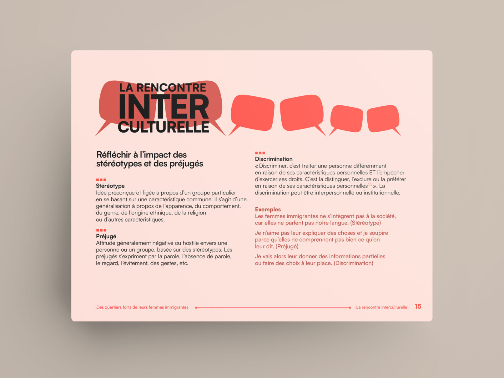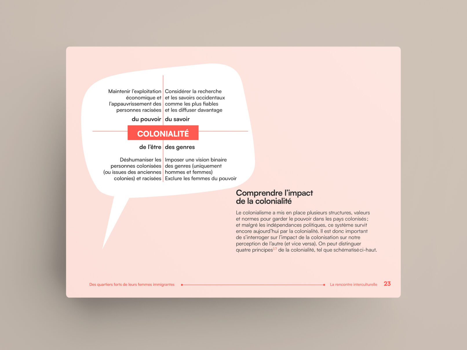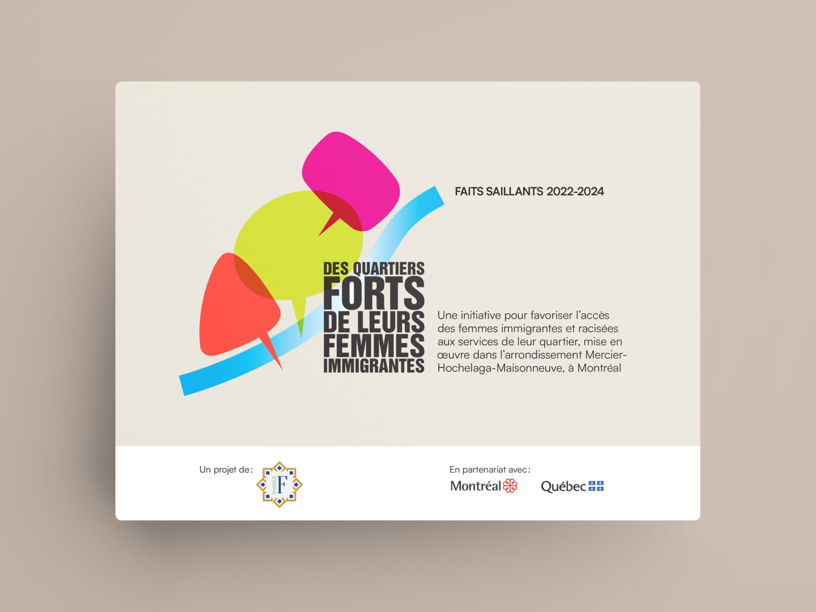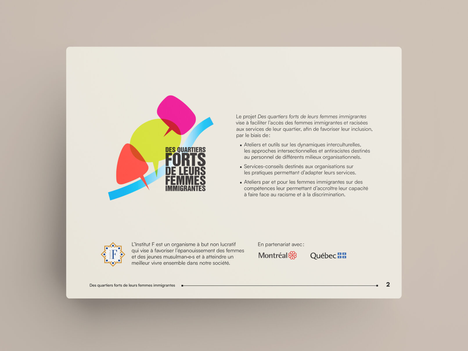 La bulle de conversation du logo du projet Des quartiers forts de leurs femmes immigrantes est utilisée comme imagerie pour renforcer son identité visuelle. Un clin d’œil à l’identité visuelle de l’Institut F se retrouve dans le filet à terminaisons carrées et l’utilisation du greige dans les page liminaires et l’annexe.