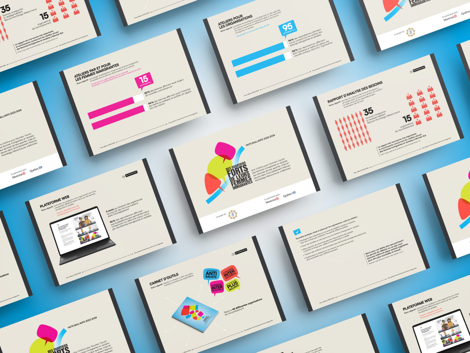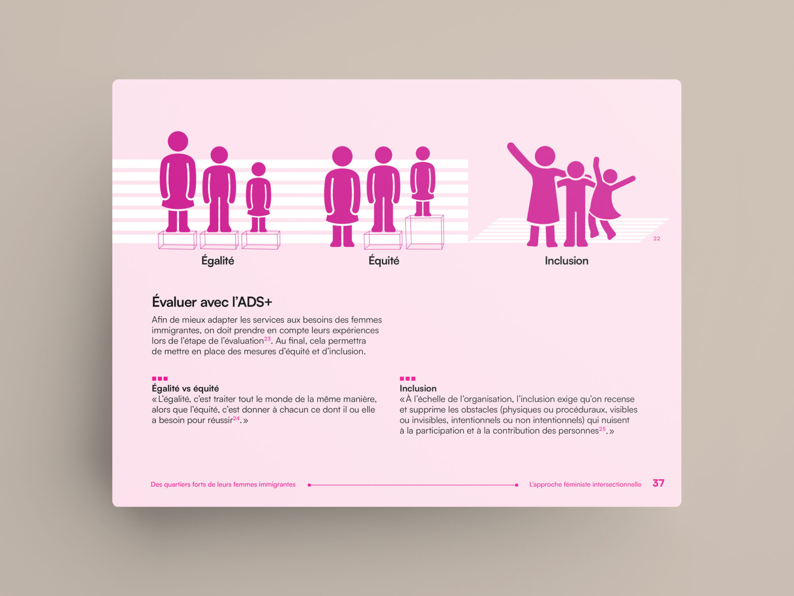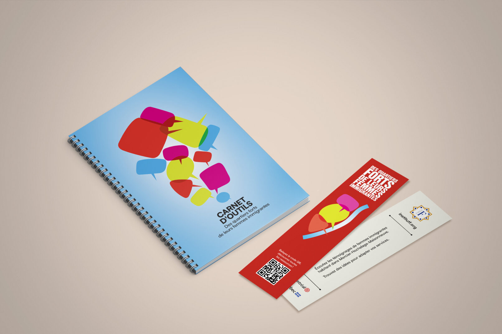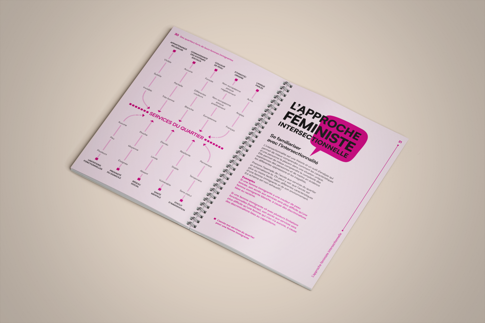 La bulle de conversation du logo du projet Des quartiers forts de leurs femmes immigrantes est utilisée comme imagerie pour renforcer son identité visuelle. Un clin d’œil à l’identité visuelle de l’Institut F se retrouve dans le filet à terminaisons carrées et l’utilisation du greige dans les page liminaires et l’annexe.