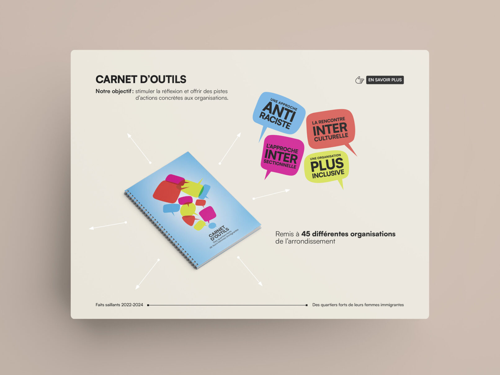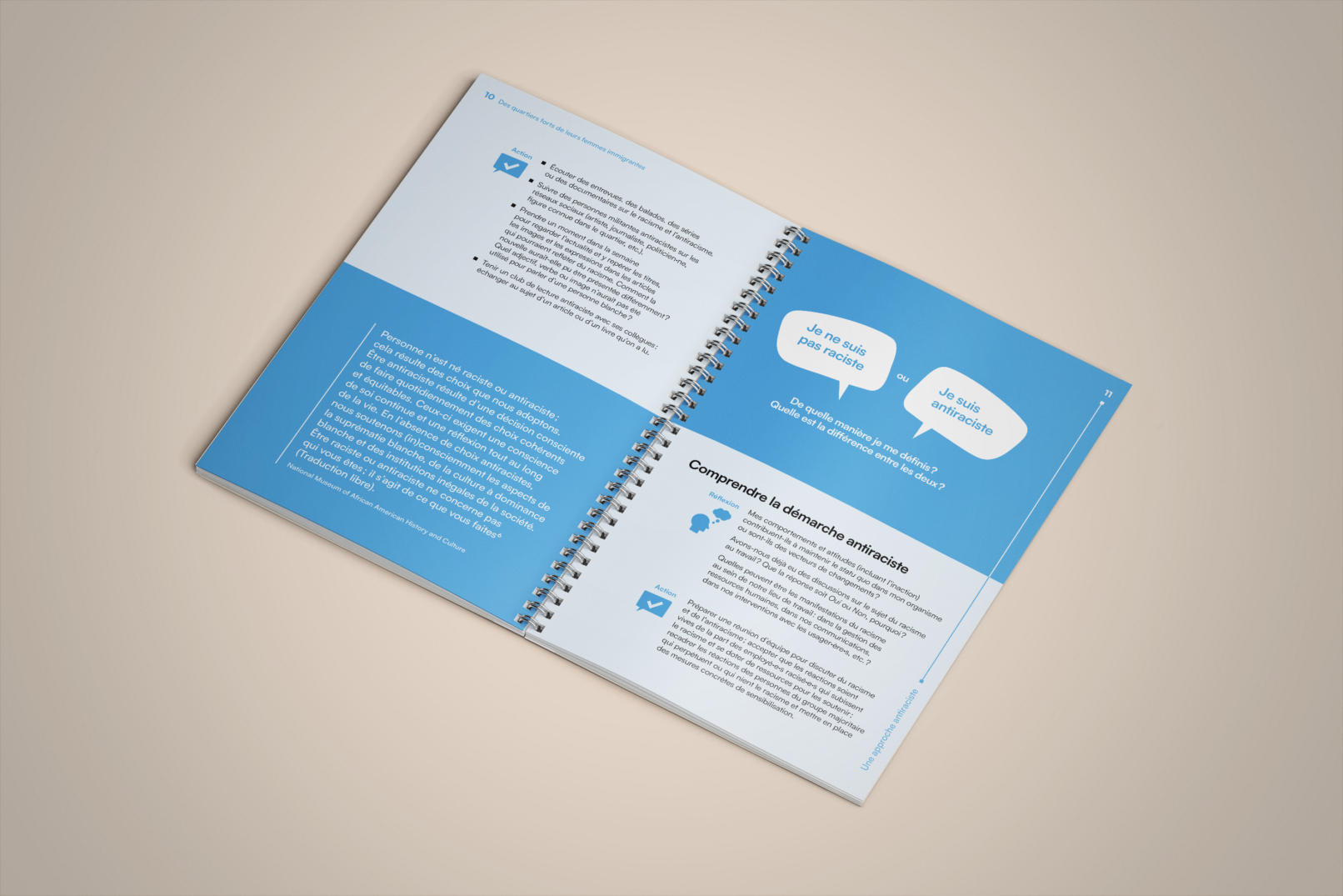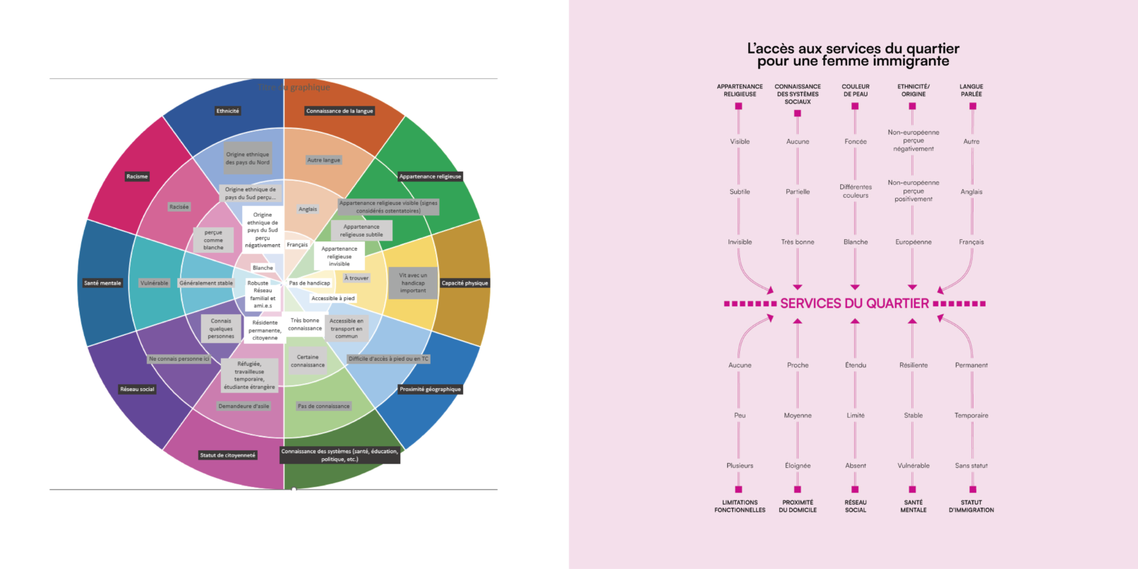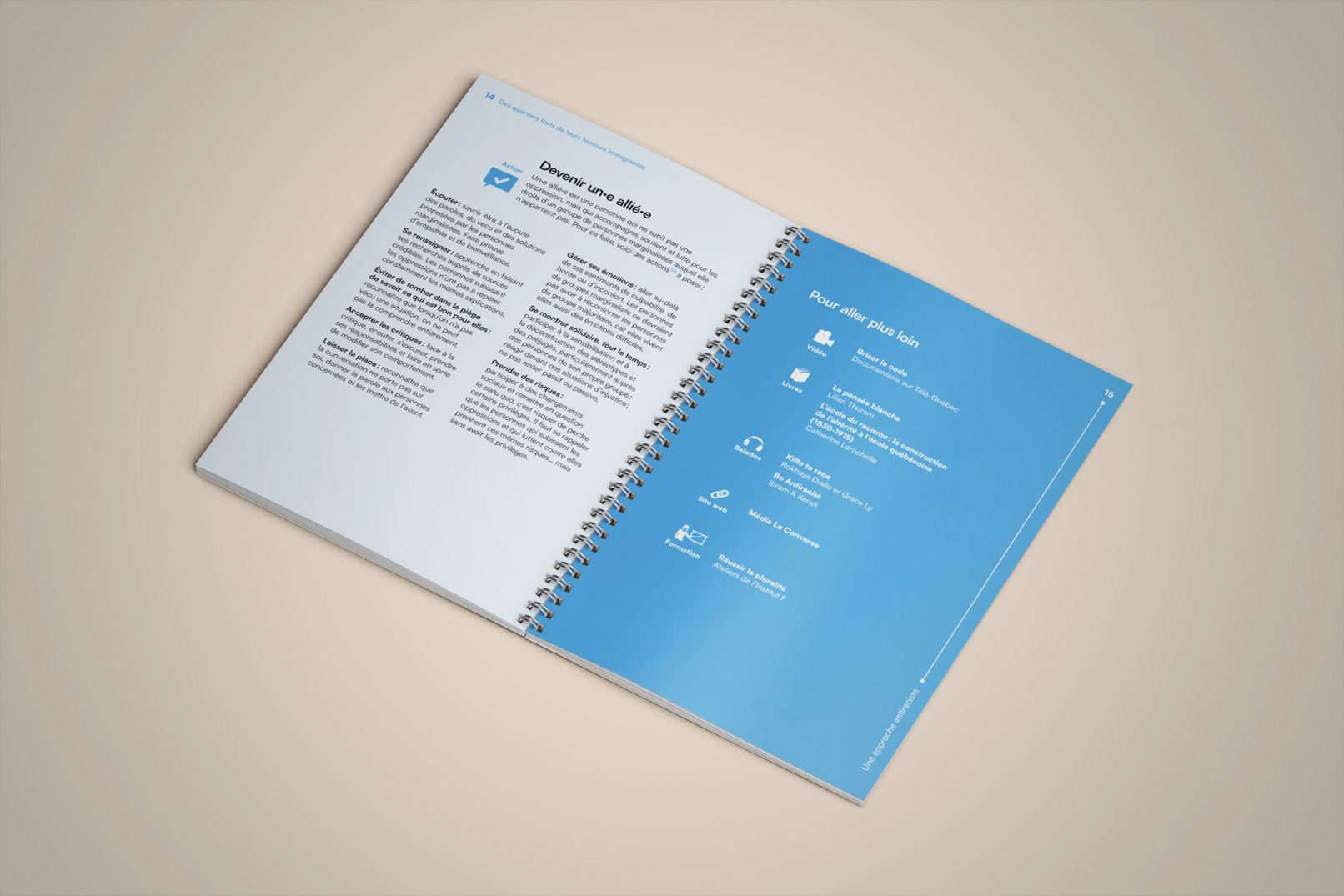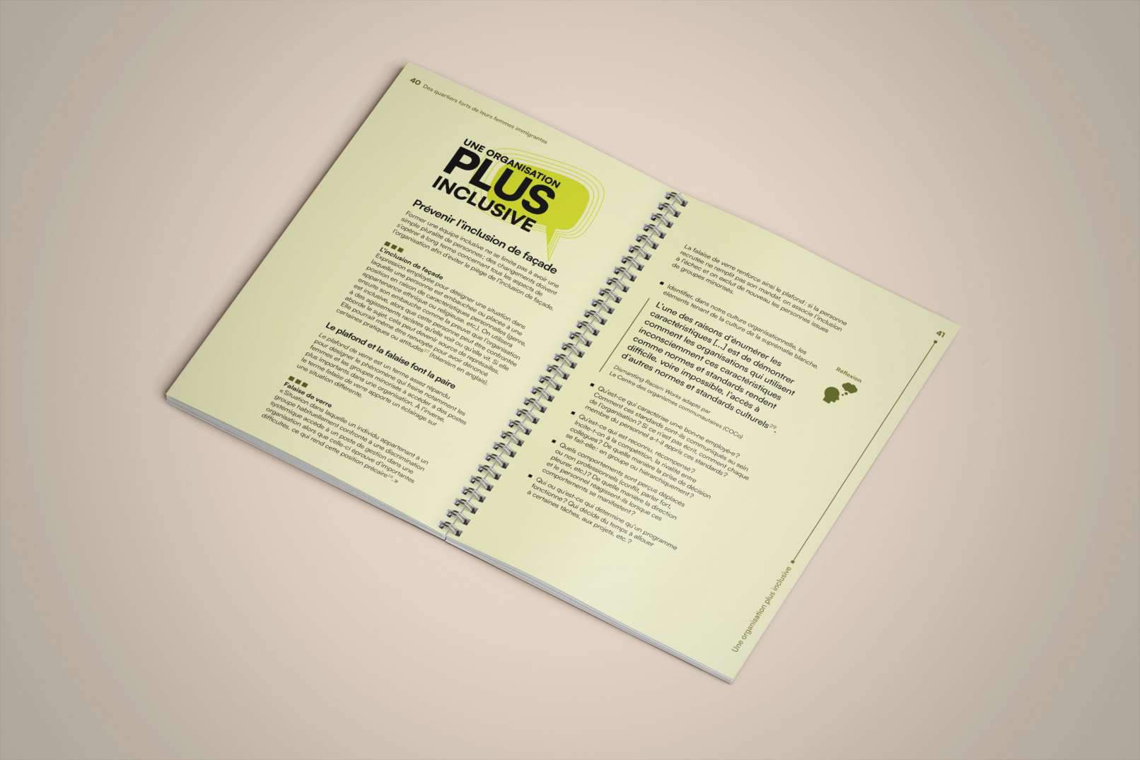 La bulle de conversation du logo du projet Des quartiers forts de leurs femmes immigrantes est utilisée comme imagerie pour renforcer son identité visuelle. Un clin d’œil à l’identité visuelle de l’Institut F se retrouve dans le filet à terminaisons carrées et l’utilisation du greige dans les page liminaires et l’annexe.
