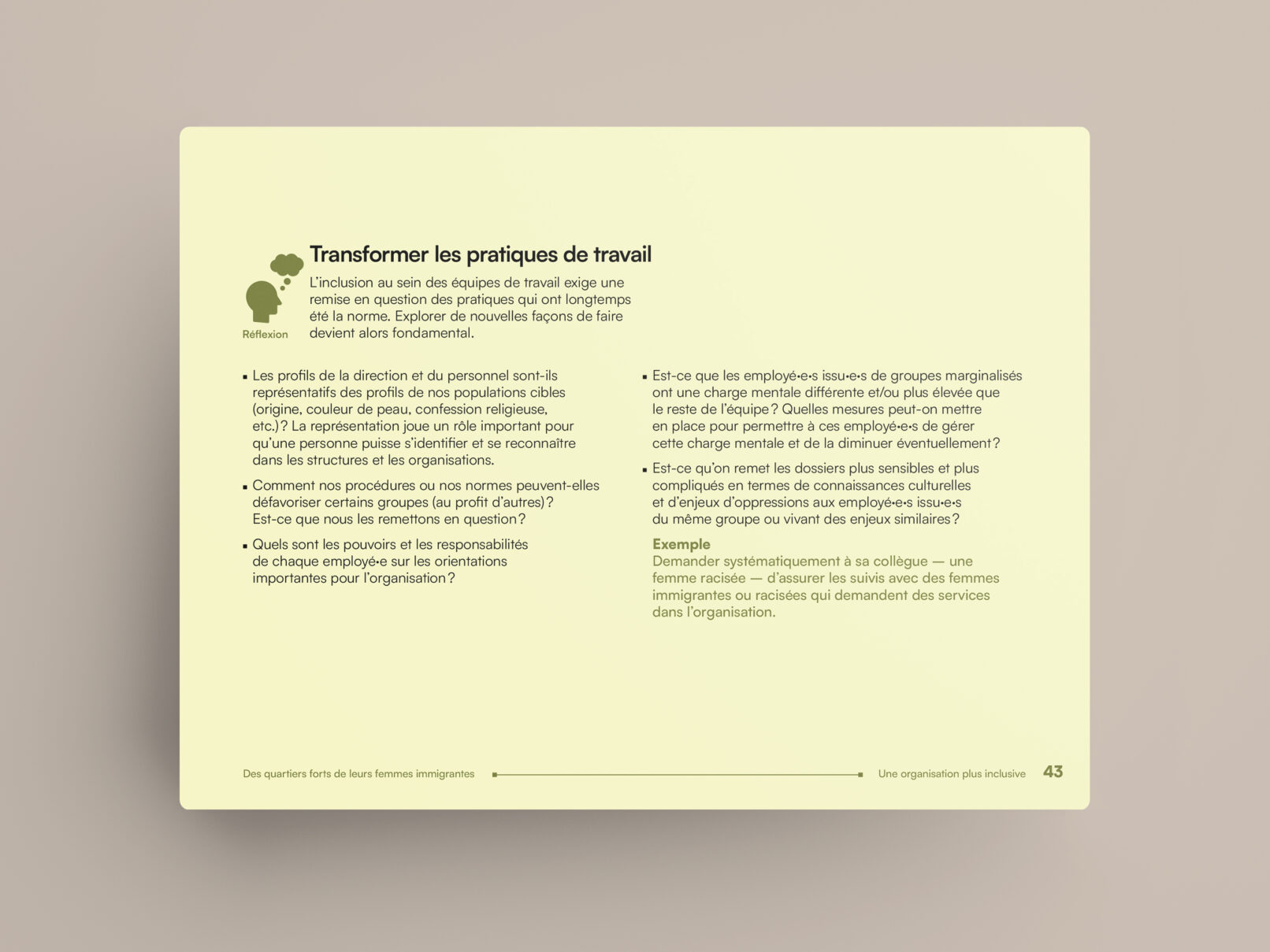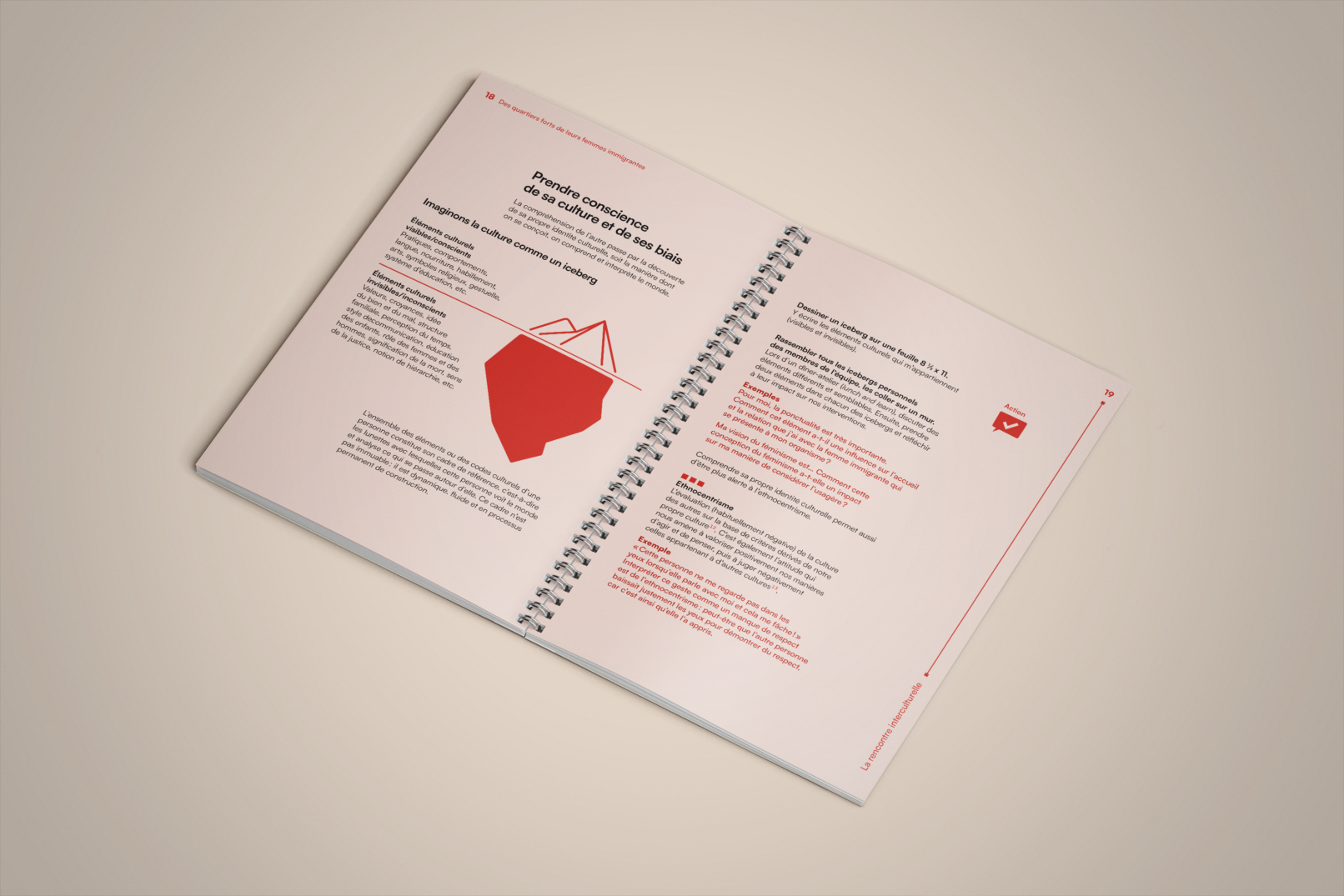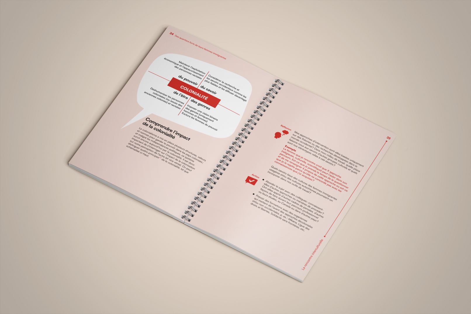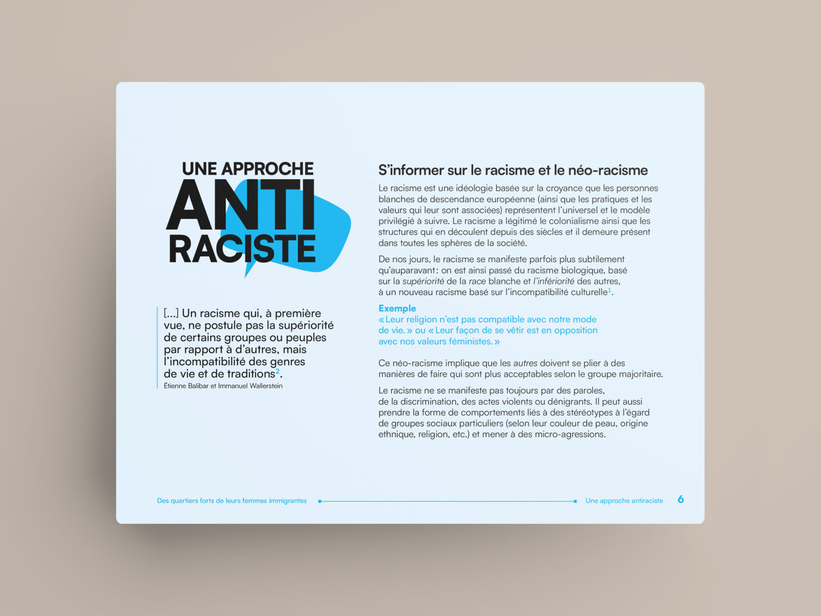 La bulle de conversation du logo du projet Des quartiers forts de leurs femmes immigrantes est utilisée comme imagerie pour renforcer son identité visuelle. Un clin d’œil à l’identité visuelle de l’Institut F se retrouve dans le filet à terminaisons carrées et l’utilisation du greige dans les page liminaires et l’annexe.