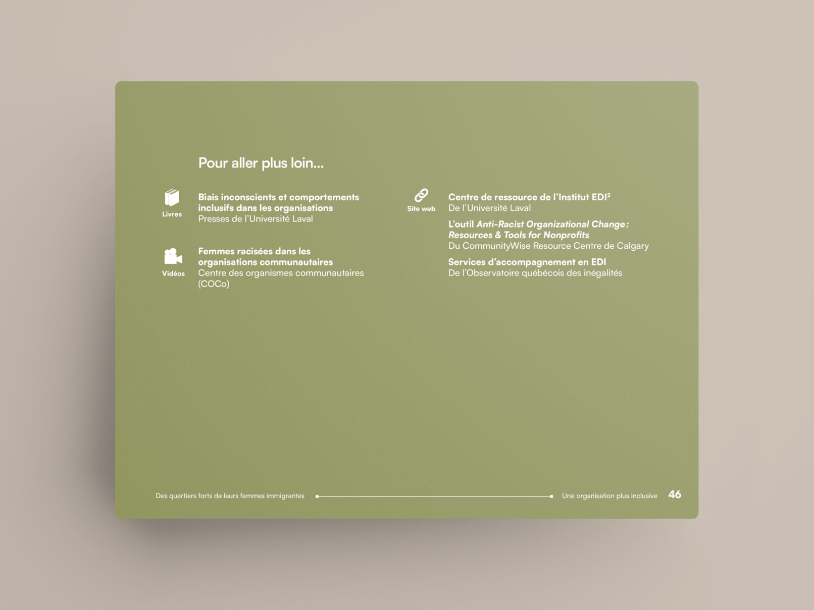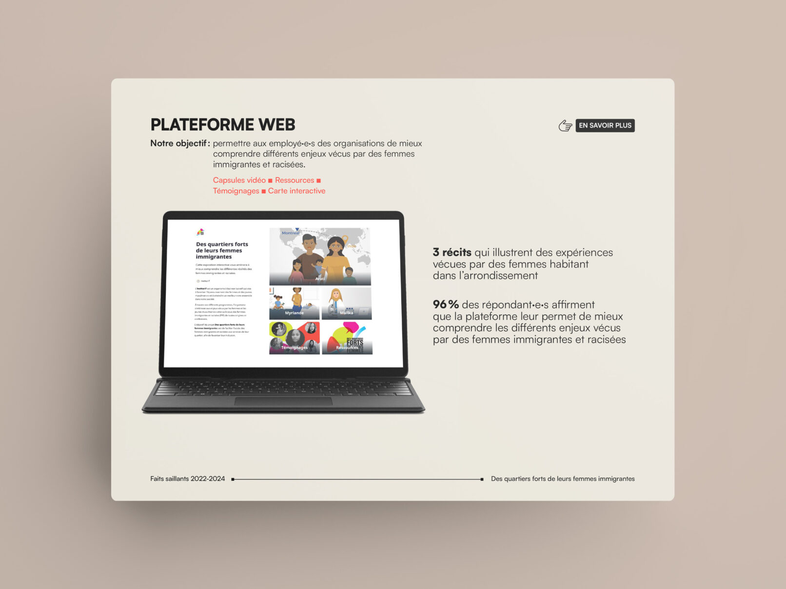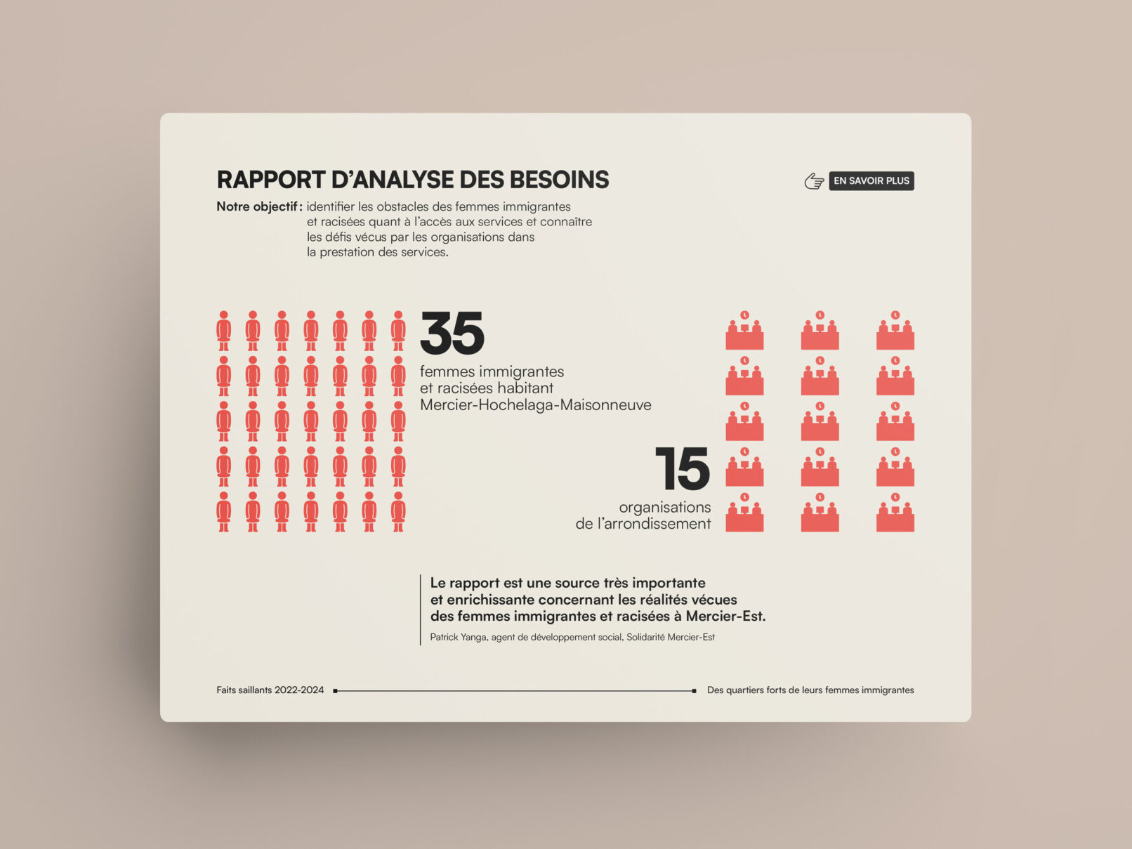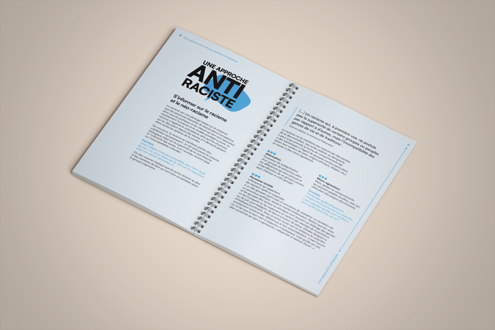La bulle de conversation du logo du projet Des quartiers forts de leurs femmes immigrantes est utilisée comme imagerie pour renforcer son identité visuelle. Un clin d’œil à l’identité visuelle de l’Institut F se retrouve dans le filet à terminaisons carrées et l’utilisation du greige dans les page liminaires et l’annexe.