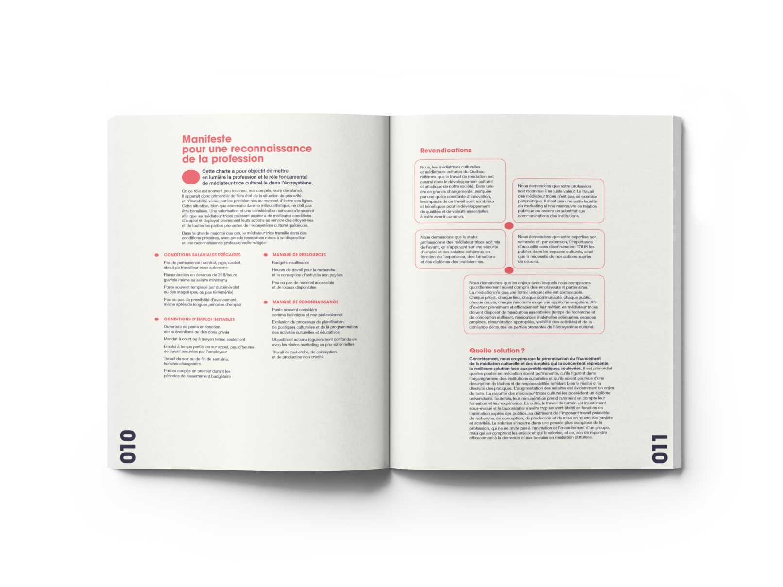 Après avoir développé leur identité visuelle, le design d’édition de leur première prise de parole officielle avec leur nouvelle image, se voulait sérieuse, sobre et créative. Le minimalisme ajoute une crédibilité et maximise la lisibilité d’un document phare du regroupement.