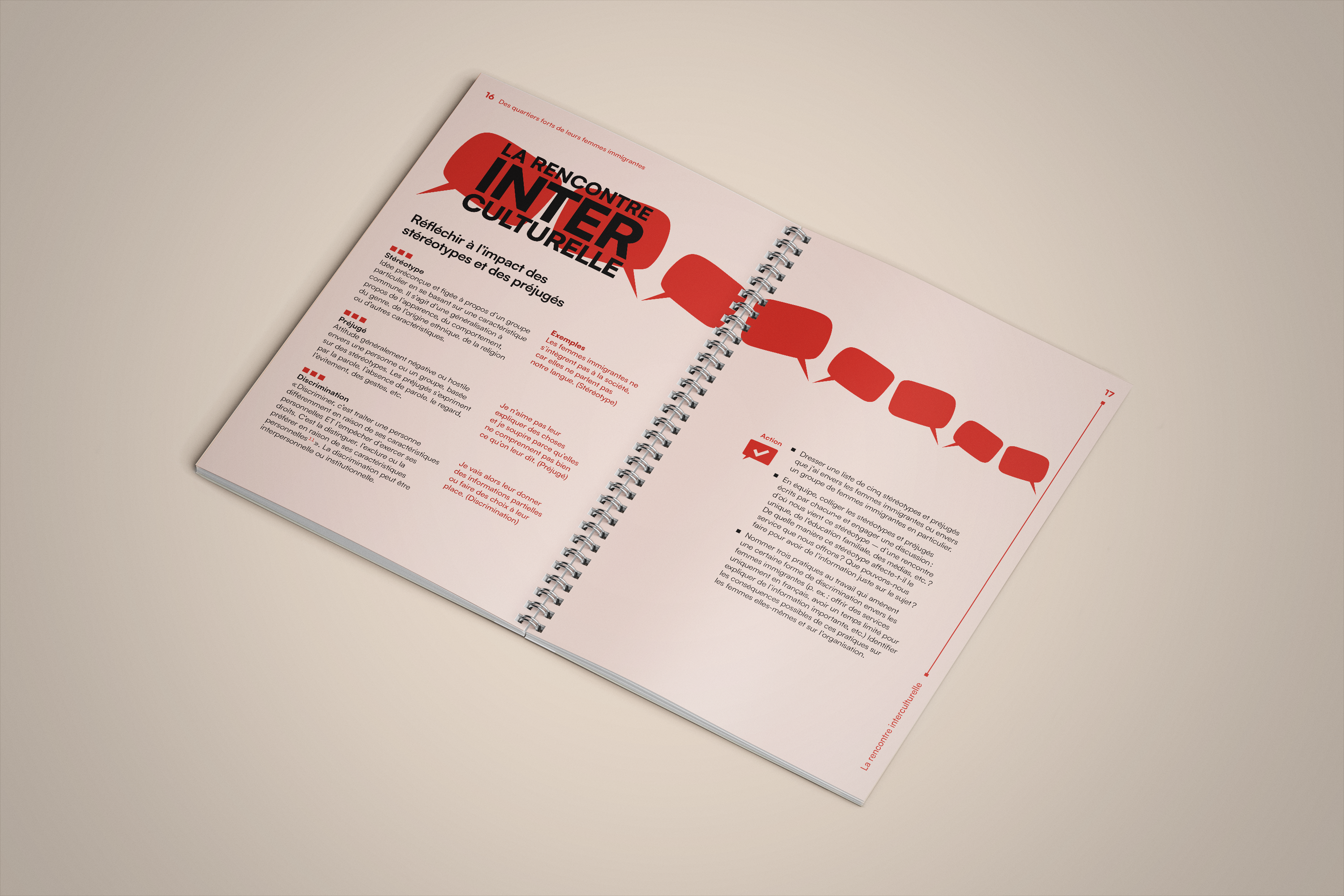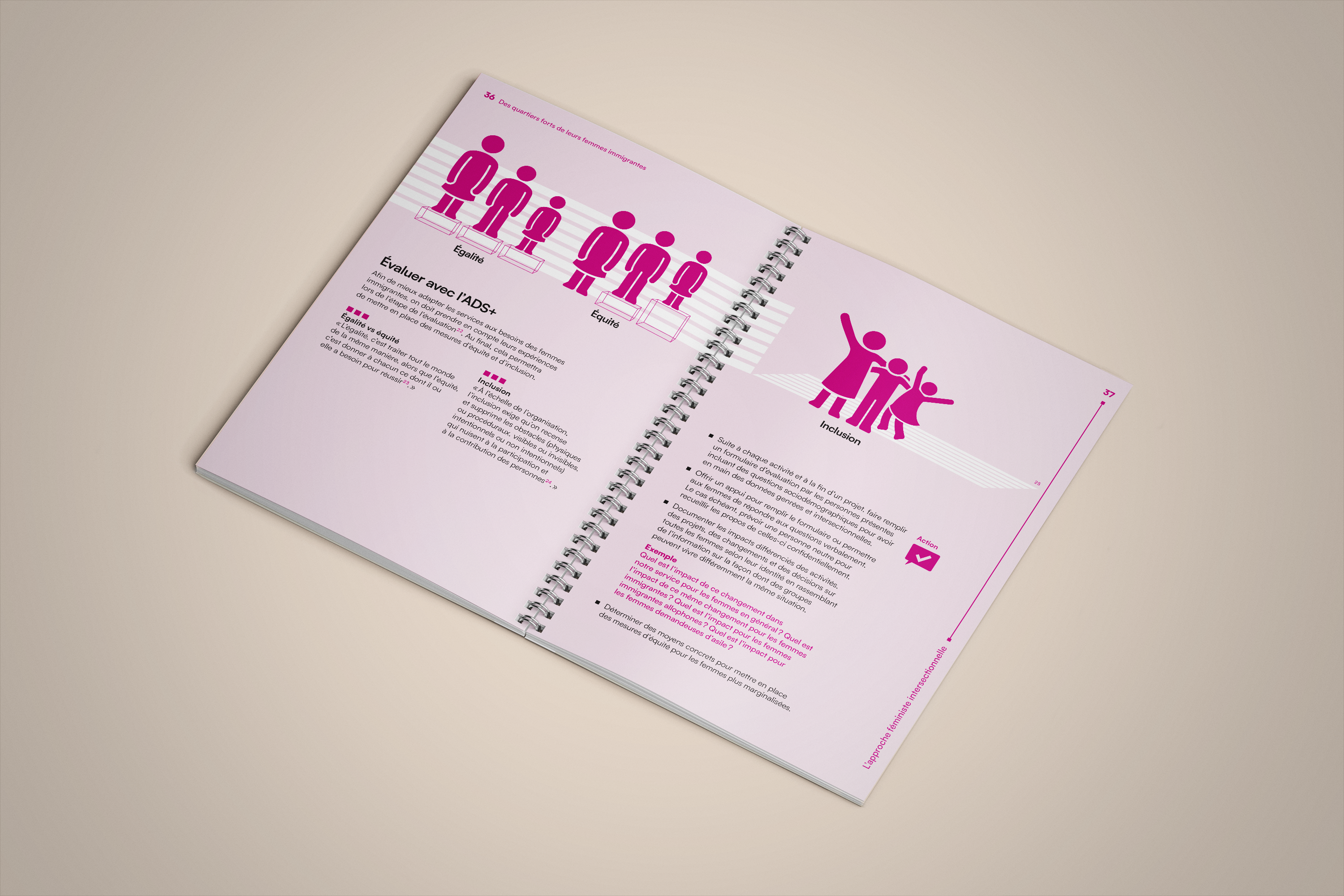 La bulle de conversation du logo du projet Des quartiers forts de leurs femmes immigrantes est utilisée comme imagerie pour renforcer son identité visuelle. Un clin d’œil à l’identité visuelle de l’Institut F se retrouve dans le filet à terminaisons carrées et l’utilisation du greige dans les page liminaires et l’annexe.