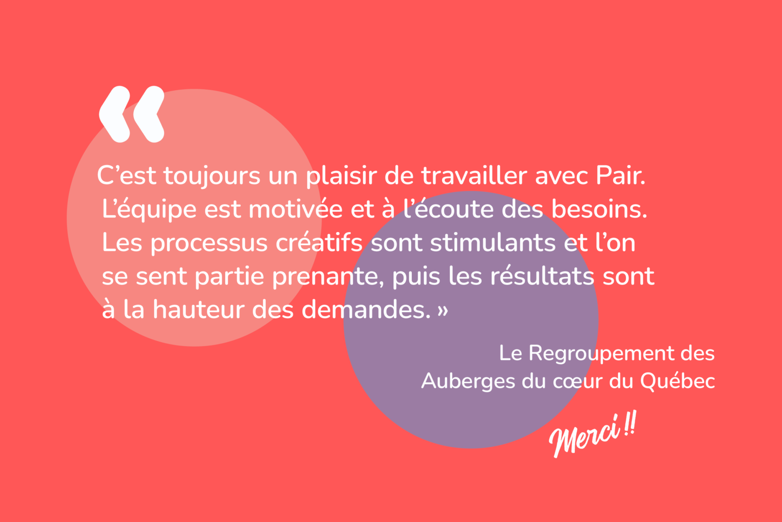 Dans le désir d’avoir une image de marque qui lui ressemble davantage, PAIR a débuté avec une bonne analyse stratégique à l’interne. À partir de leur concept créé sur Canva, et l’envie d’avoir une image moins corporative, la direction artistique se voulait humaine, créative et humble tout en conservant son professionalisme.