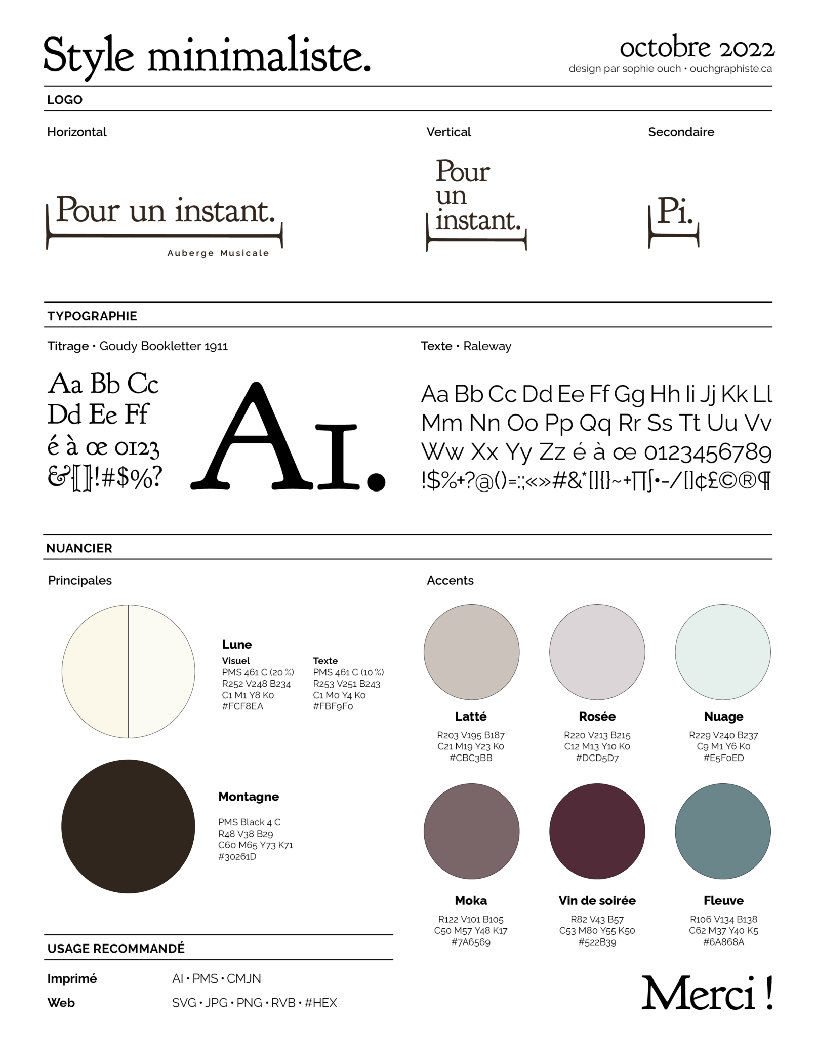 L’identité visuelle reflète cet état d’esprit. L’aspect musical n’est pas représenté de façon clichée malgré son caractère distinctif. La direction artistique se veut épurée et reposante. La nouvelle image de l’auberge musicale Pour un instant dégage une modernité sans artifices tout en respectant son côté ancestral.