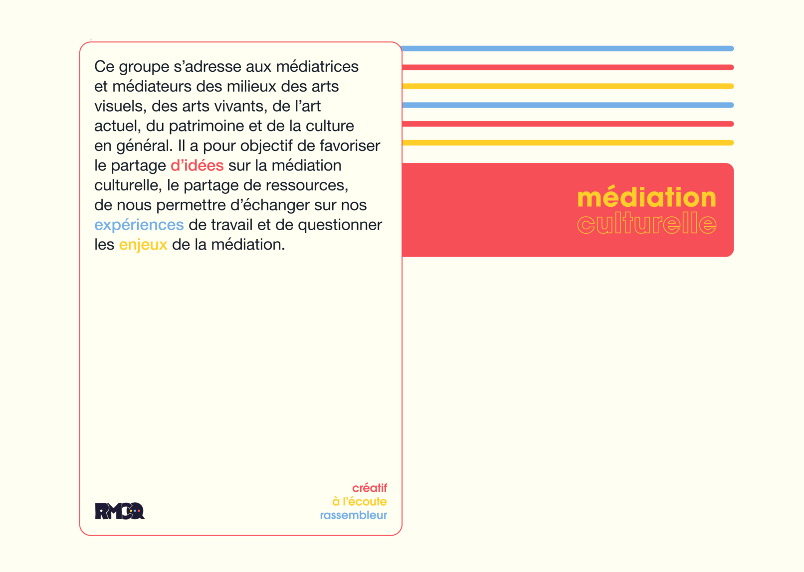 ⇣ Le regroupement des médiatrices et médiateurs culturel·les du Québec (RMCQ) est un organisme sans but lucratif. Il est le premier à rassembler les praticien·nes de la médiation culturelle au Québec. La création de ce réseau contribuera à la reconnaissance et la valorisation de la profession. La survie de la Culture dépend largement de ceux et celles qui rapprochent celle-ci du citoyen.