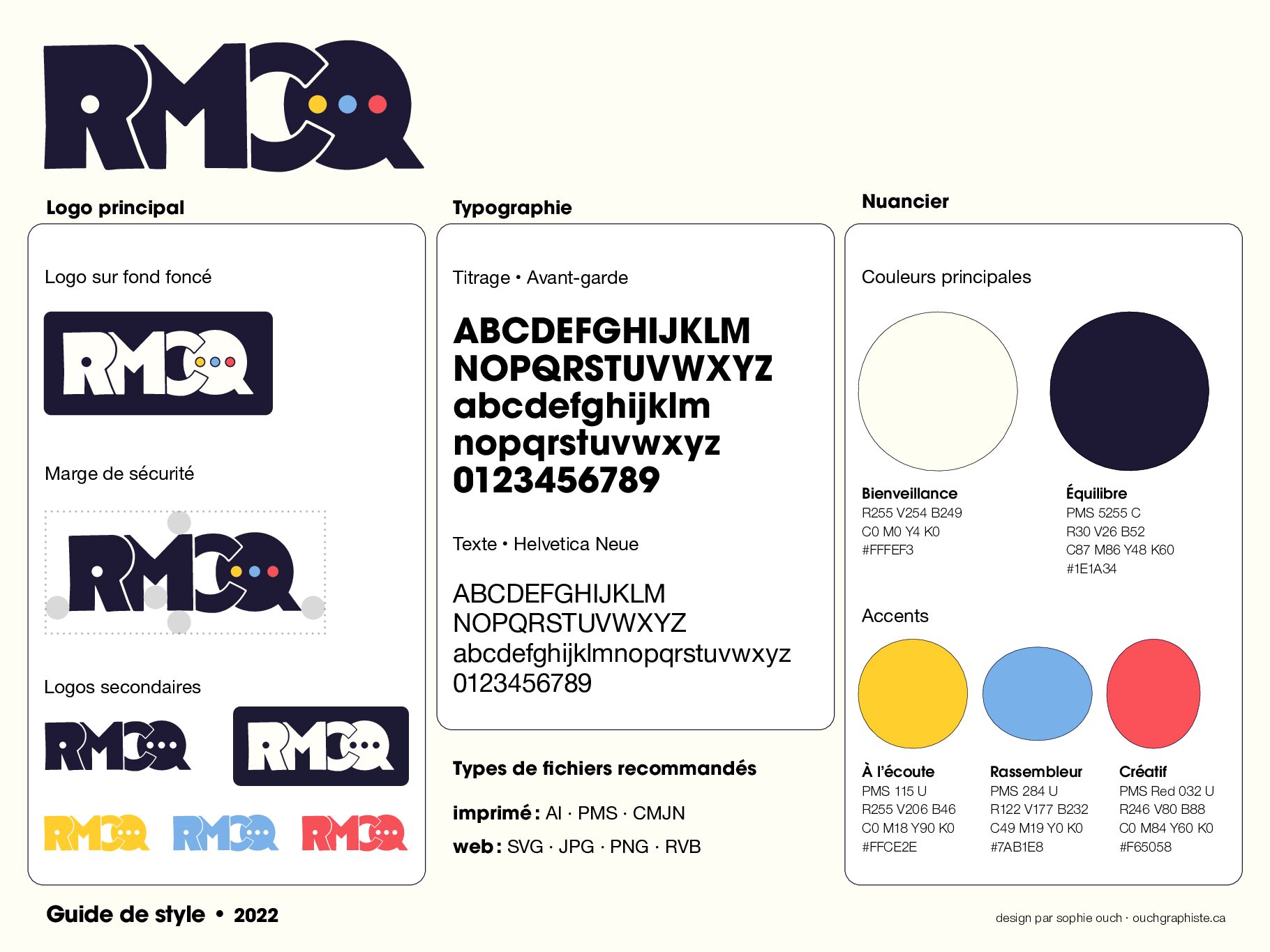 Au final, l’identité visuelle du RMCQ est professionnelle, humaine et ludique. Elle dégage une solidarité et une ouverture d’esprit. La charte des médiatrices culturelles et médiateurs culturels du Québec que j’ai eu le plaisir de faire le design d’édition, met en œuvre les normes de leur nouvelle identité visuelle.