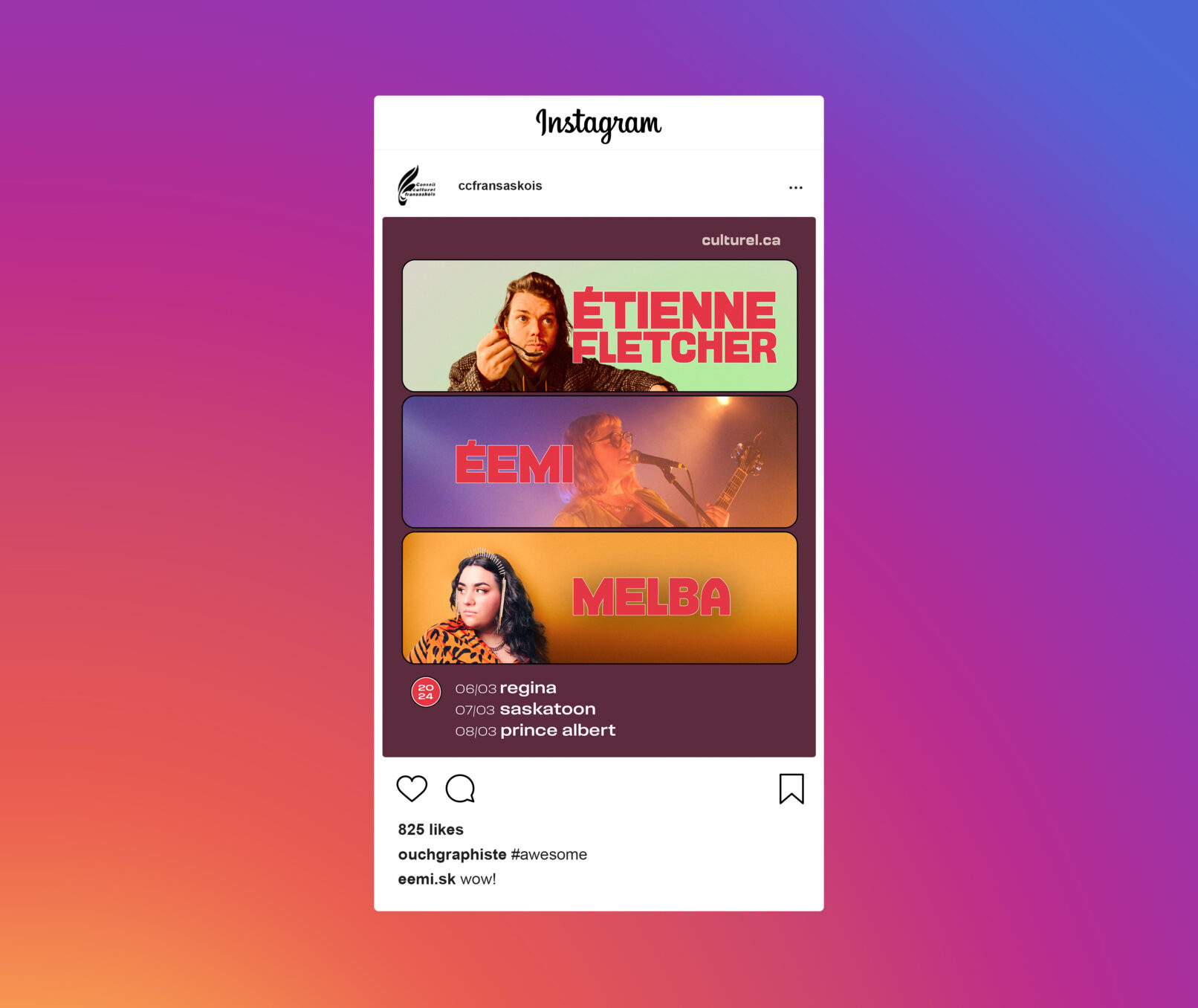 ⇣ Le Conseil culturel fransaskois (CCF) est le porte-parole de la communauté francophone fransaskoise dans le secteur des arts et de la culture. Pour la saison 2023-24, il organisait plusieurs tournées de spectacles dont ces trois-ci.